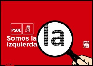 La viñeta de Malagón, publicada en Ctxt, pone un dedo en el interés del P$OE para que veamos sólo su imagen de la izquierda, y por el otro, la lupa señala su deriva su deriva contraria. Dos formas de mirar, y dos formas de ver