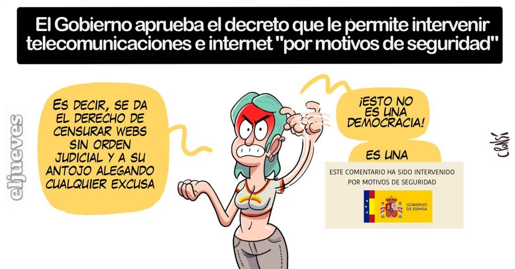 La “democracia” en España es como el “chocolate del loro”, que el Estado cree que con poner una “España Global” haciendo publicidad, es suficiente para ser lo que pide Europa. Pero 40 años no es nada… “Y aunque no quise el regreso, Siempre se vuelve al primer amor”. O algo así dice el tango. Y Pedro, el “Eterno en funciones” se abraza al cargo como si fuera una farola que pasaba por allí y saca de la chistera un real decreto-ley, (atentos que el el “Preparao” VI de los Borbones, o algo así, está en el meollo de la cuestión) que se merienda trozos de seis leyes, para emular al Corcuera en sus años mozos y de una “patada en la puerta” vuelve a darla, pero esta vez a las páginas webs, redes sociales, o lo que haga falta con tal de derribar al contrincante político, en este caso la “República Digital” o lo que es lo mismo, el Tsunami Democràtic. Aunque todo esté escondido detrás de los “supuestos” casos excepcionales que puedan afectar el “orden público”, la “seguridad pública” y la “seguridad nacional”. Al más puro estilo autoritario turco, chino o ruso. Que junto a la ley Mordaza y la modificación del Código Penal, adiós derechos. La CENSURA hace su agosto de la mano de los autodenominados de “izquierda” y “socialistas” cuya mejor representación está en la monarquía.