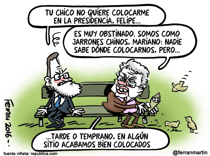 Ya desde principios del 2014 los jarrones chinos “socialistas” mostraron su inquietud ventilando la idea de una gran coalición PP-PSOE, y Rubalcaba se montó al filo del nervio cuando el “sevillano” soltó el dardo, hasta el punto que tuvo que corregir con un “Si el país lo necesita”. Anasagasti, le llamó “metomentodo”. Cuando el río suena, agua lleva, y la liebre quedó suelta. Pero fue más fuerte para la piel sensible de los políticos socialista que Zapatero, se saltara el orden debido y se fuera de parranda una noche con Iglesias y Errejón. ¡Vade retro! ¡Traidor infiel! Gritaron los puristas. Renquear hacia la izquierda fue más fuerte que escorar a la derecha. Y eso que fue en casa de Bono, que poca jarana habría, en todo caso un rosario antes que una misa.